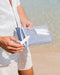 Örtrefjahandklæði sem innihalda vatnsheldan vasa með rennilás, burðar tösku og klemmur til að festa það niður eða tengja við önnur handklæði.