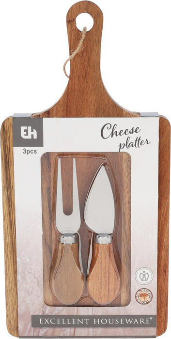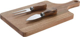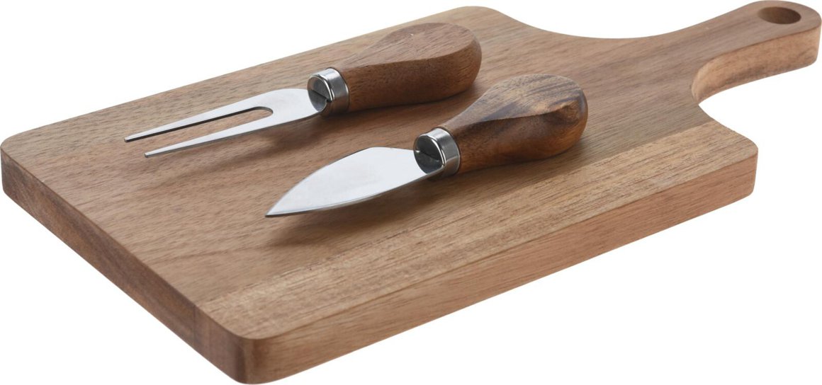 Bretti úr asískum við og ostahnífar úr ryðfríu stáli. Gott að bera Olíu á öll viðarbretti áður en byrjað er að nota þau og leyfa henni að fara inn í viðin og eftir nokkra tíma strúka yfir með pappír/servéttu eða tusku fyrir notkun.