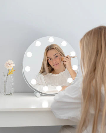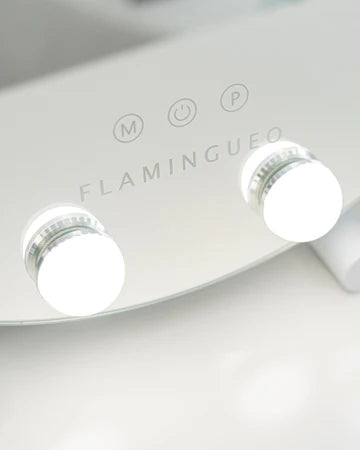 Í einni af vinsælustu línu Falmingueo er þessi pro LED hringspegill fyrir snyrtiborðið, skrifborðið eða inn á baðherbergi. Spegillinn er með innbyggðum LED ljósaperum sem ramma hann inn og gefa jafna og góða birtu. Spegillinn er með snertistýringu og þremur birtustigum, kaldri birtu, dagsbirtu og hlýrri birtu. Spegillinn er á stöðugum fæti sem er hægt að halla fyrir aukin þægindi. Hægt er að hlaða spegilinn með USB tengi eða rafhlöðum.