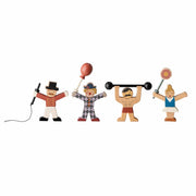 Leikfangasettið inniheldur 16 stykki af hlutum sem setur saman 4 týpur af sirkus leikföngum.