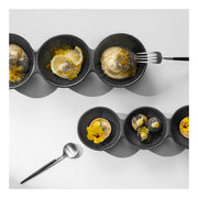 Þriggja skála sett úr svörtum steinleir með járngljáa sem fæst í tveimur stærðum. Skálarnar eru hannaðar fyrir fjölbreytta notkun, til dæmis framreiðslu, snakk eða sem skraut.